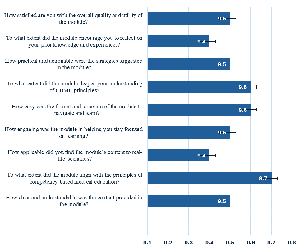 Feedback on the module was collected using a 9-item questionnaire rated on a 10-point scale, providing insights into its clarity, relevance, and practical value. Students expressed high satisfaction, with ratings consistently above 9.4 across all parameters (Figure 3). Specifically, 95% of students reported that the module effectively clarified CBME principles and their role in medical education. Additionally, 92% of students found the reflective exercises particularly useful in helping them internalize competency-based learning concepts, while 94% agreed that the module provided actionable strategies for transitioning into CBME.
