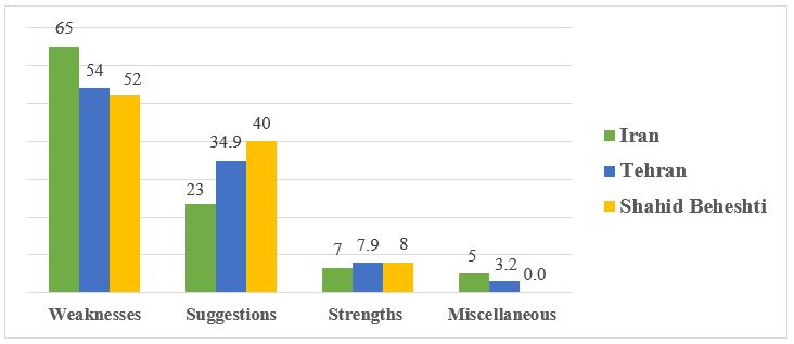 As shown in Figure 1, 34 responses (54%) from TUMS, 39 responses (65%) from IUMS, and 12 responses (52%) from SBUMS highlighted weaknesses. Only 5 responses (7.9%), 4 responses (6.67%), and 2 responses (8%) from TUMS, IUMS, and SBUMS, respectively, were related to curriculum strengths. Figure 2 shows the distribution of responses from graduates in various fields of basic medical sciences at TUMS, IUMS, and SBUMS to the qualitative question. As shown, 33.3% of respondents were from the Immunology department at IUMS, 25% from the Physiology department at SBUMS, and 16% from the Biochemistry department at TUMS. Graduates in Reproductive Biology from all three universities provided no responses to the qualitative question.