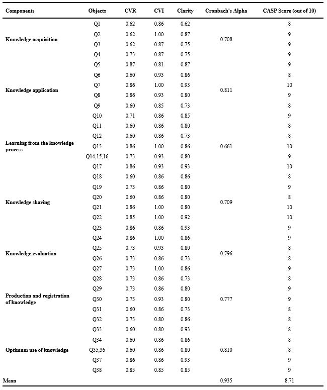 Cronbach's alpha for all seven components of knowledge management ranged from 0.661 to 0.811, showing acceptable reliability across the components. Also, the overall Cronbach's alpha for the 38 questions covering the seven components was calculated to be 0.935, showing the high reliability of the questionnaire used in this study (Table 1). The CASP scores for each question are presented in Table 1.