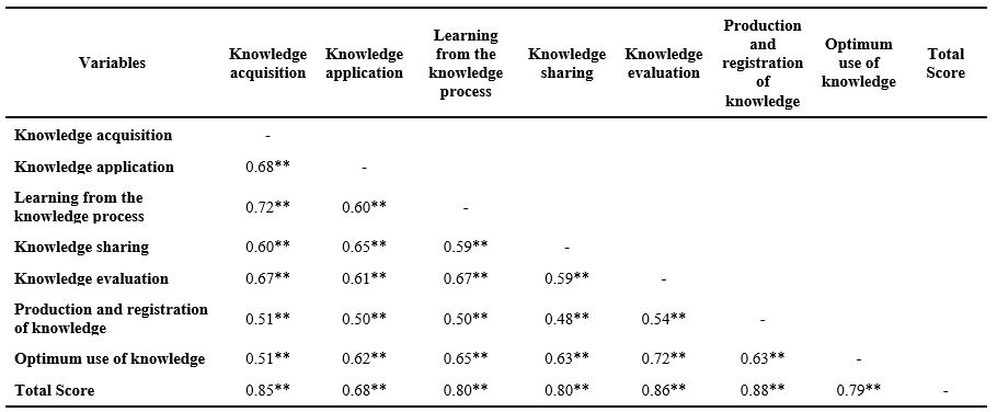 These items covered the following components: knowledge acquisition (4 items), knowledge application (7 items), learning from the knowledge process (6 items), knowledge sharing (6 items), knowledge evaluation (4 items), knowledge production and registration (5 items), and the optimum use of knowledge (elimination of unnecessary knowledge) (6 items).