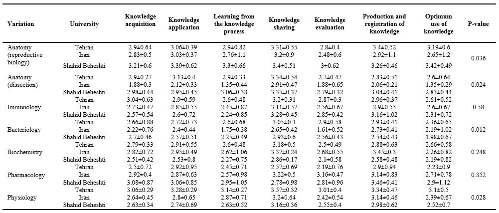 In contrast, the least frequently used components are "learning from the knowledge process", with a mean score of 2.53 at IUMS, and "knowledge evaluation", with mean scores of 2.69 at TUMS and 2.62 at SBUMS. Table 5 presents the mean ± standard deviation for each of the knowledge management components in the PhD courses at TUMS, IUMS, and SBUMS. According to these results, "knowledge sharing" remains the most frequently used component, and no significant statistical differences were seen among the universities (p > 0.05).