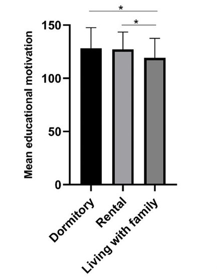 Pairwise comparisons using Tukey's test revealed that the mean motivation score of individuals living with their families was significantly lower than that of students who had rented a place (p = 0.029) or were living in a dormitory (p = 0.020).