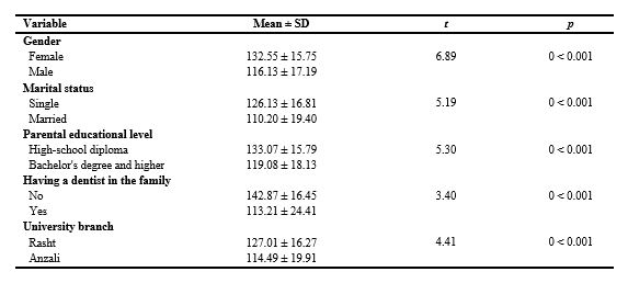 Table 2 presents the association between gender, marital status, parental education level, having a dentist in the family, and university branch, and the academic motivation score.