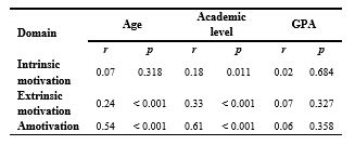 Table 3. Correlation of academic motivation domain scores with age, academic level (term), and GPA of students