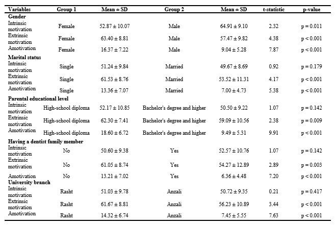 Results: Of 200 participants, 117 (58.5%) were males, and 160 (80%) were single. The mean age was 24.33 ± 1.66 years. Academic motivation was significantly associated with age, gender, marital status, parental level of education, family financial status, academic level, having a dentist in the family, and university branch (p < 0.001). Females acquired a significantly higher mean score in all three domains than males (p < 0.05). The mean scores of extrinsic motivation and amotivation were significantly higher in singles, students whose parents had a high school diploma (compared with those with a higher educational level), students who did not have a dentist in their family, and students attending the Rasht branch (p < 0.05). Place of residence had a significant association with the amotivation score (p < 0.001), and family financial status had significant associations with both extrinsic motivation (p < 0.001) and amotivation (p < 0.001) scores.