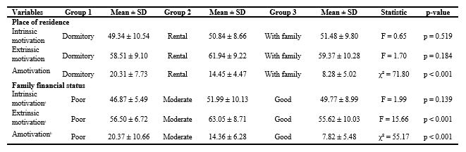 Note: One-way ANOVA was used for comparisons marked with a, and the Kruskal-Wallis test was used for comparisons marked with b. For place of residence comparisons, one-way ANOVA was used for intrinsic and extrinsic motivation, and Kruskal-Wallis test was used for amotivation.