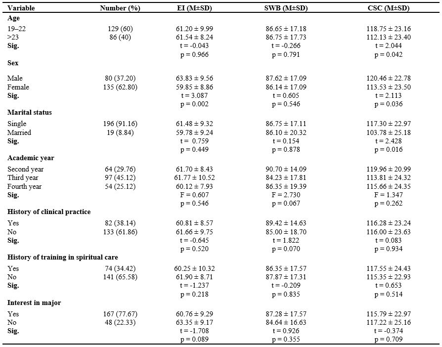 Table 2. Descriptive data for outcome variables, including CSC, EI, and SWB in nursing students (n = 215)