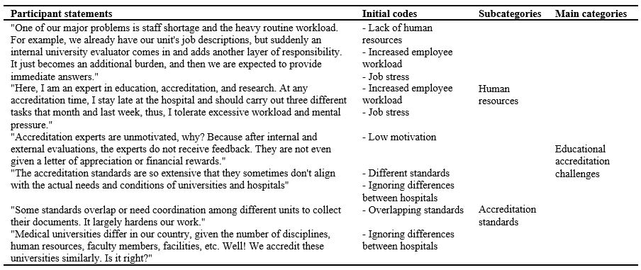 Human resources: Lack of human resources and increased employee workload were among the challenges addressed by many participants. Due to the lack of human resources at hospitals, educational accreditation experts often handle multiple roles and responsibilities. Engaging in different tasks will lead to confusion and fatigue and raise mental stress.