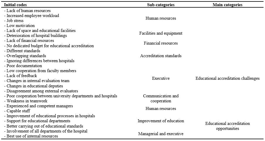 Results: The opportunities and challenges of educational accreditation at the teaching hospitals fell into two main categories and nine subcategories. Educational accreditation faces different challenges including human and financial resources, facilities, accreditation standards, program implementation, and intra- and extra-organizational cooperation. The privilege of experienced and competent managers and employees, the promotion of educational processes, and the best use of internal capacities are opportunities to carry out this program.